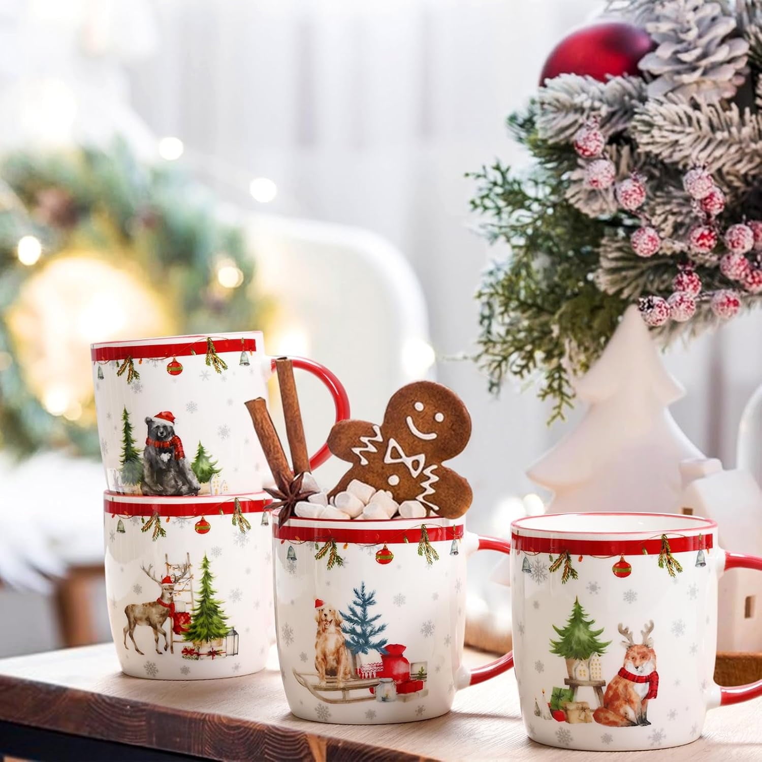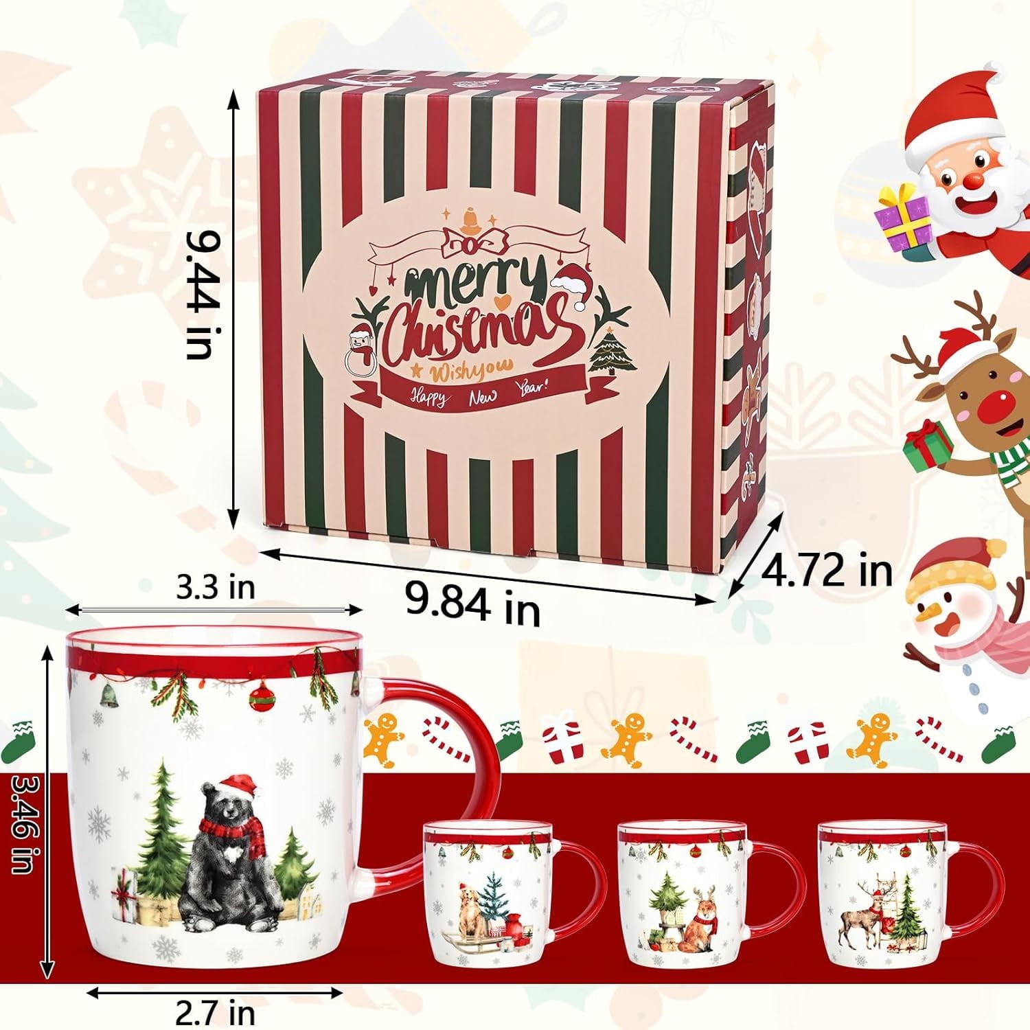 Futtumy Christmas Mugs, Christmas Mugs Set of 4, Holiday Mugs, Merry Christmas Mugs, White Red Coffee Mug Ceramic Mugs Tea Cup, 11 fl oz